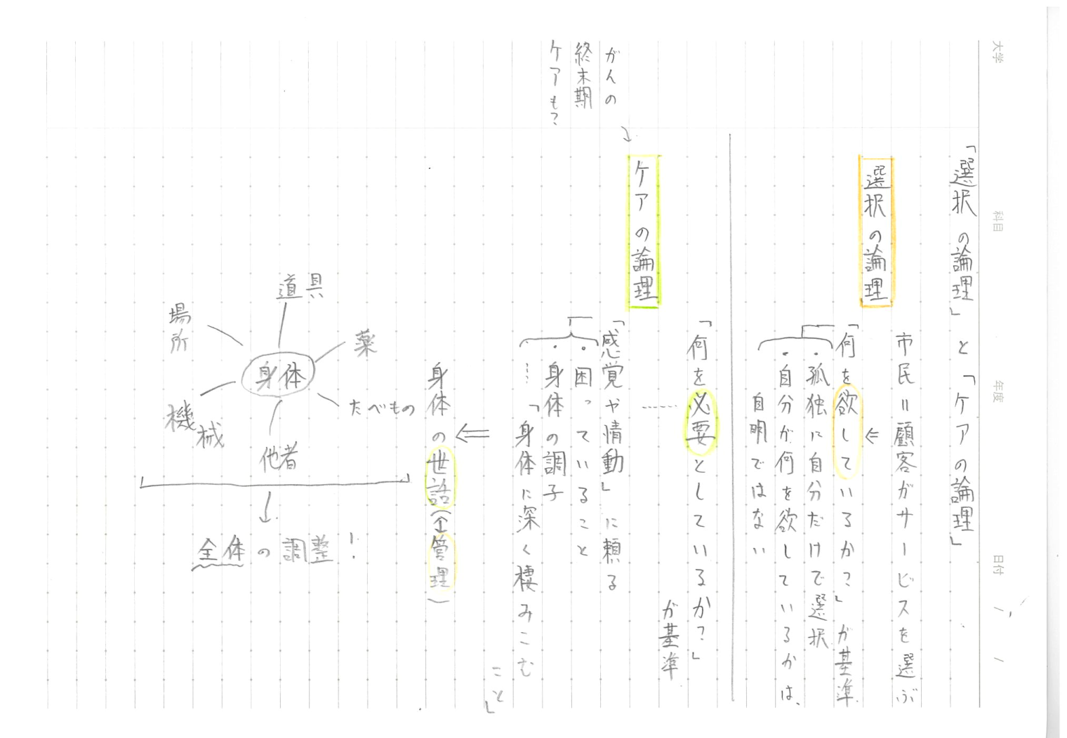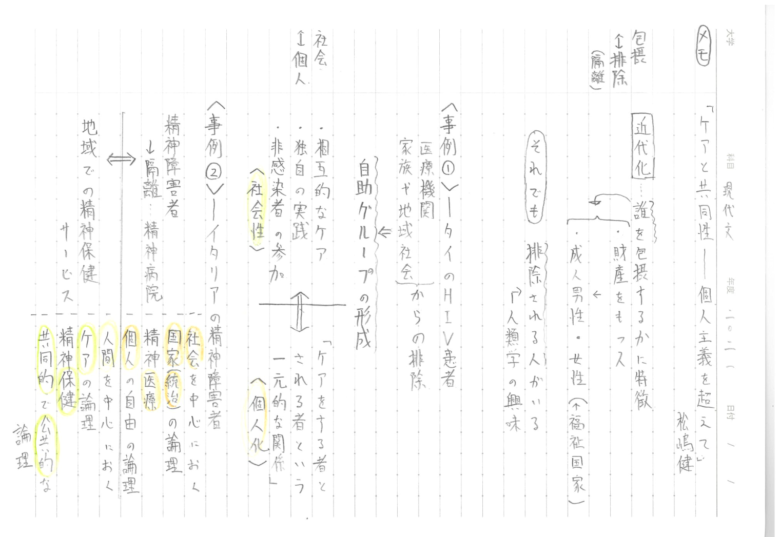 小池先生のコメント:「文章全体の展開を、端的に図示することができています。特に、対比の構造についてはかなり正確にまとめられました。ただし、単語やフレーズの抜き出しが中心になってしまっており、筆者の主張するところがやや見えにくい。もう少し、「文章」としてのまとめも付加したほうがよいかもしれません。」