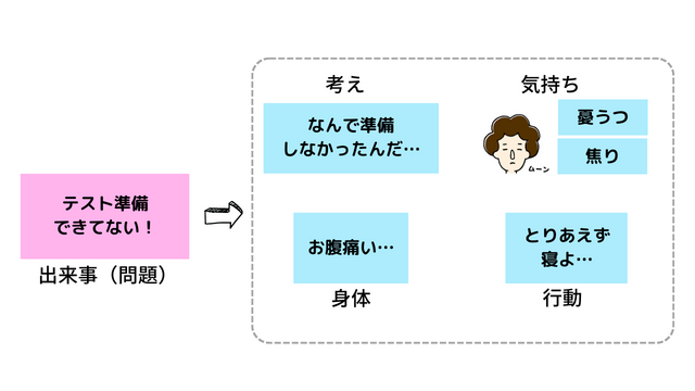 ②『なんで今まで準備してこなかったんだろう』『だいたい、この時期に実力テストをするなんて、ひどい』『どうせ今からやっても間に合わない』といった「考え」が浮かび、